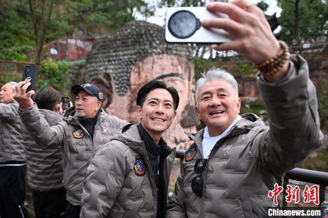 3月15日,四川乐山,大佛佛头观景平台中国香港男演员、歌手罗钧满(左二)和吴岱融(右一)用手机自拍合影。中新社记者 刘忠俊 摄