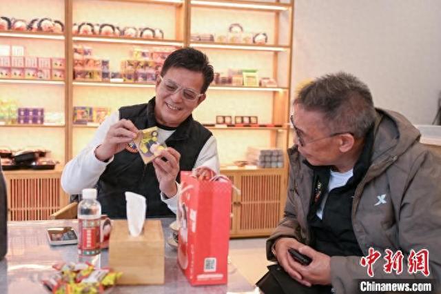 3月15日,四川乐山,乐山大佛景区工作人员给中国香港影视演员、粤剧演员罗家英送上大佛文创产品。中新社记者 刘忠俊 摄