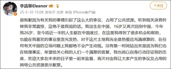 @李凱馨Eleanor 随后转发该声明,并回应说:“很抱歉因为有关我的事情引起了这么大的争议,占用了公共资源。听到相关录音时候我非常震惊,这绝不是我说的话。我出生在中国,16岁又再次回到中国,今年我26岁,至今将近一半的人生都在中国度过,在这里我得到了很多机会和帮助,也能在我喜欢的事业里发光发热,对于这片土地我完全是热爱且充满感激的,在任何有关中国的立场问题上我都绝不会产生动摇。”