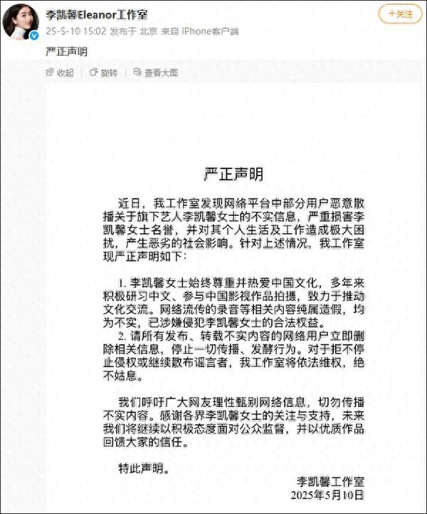 @李凯馨Eleanor工作室 5月10日发布严正声明称,网络流传的录音等相关内容纯属造假,均为不实。请停止一切传播、发酵行为,工作室将依法维权。