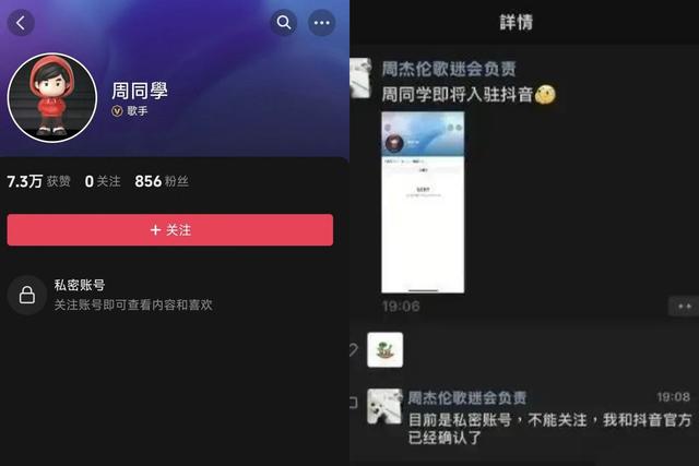 7月8日,据多家媒体消息,周杰伦即将入驻抖音平台,称“周杰伦歌迷会负责”朋友圈证实了此消息,目前是私密账号,无法关注。更有网友直接爆料,此次与周杰伦签约,抖音方面花费了九位数。