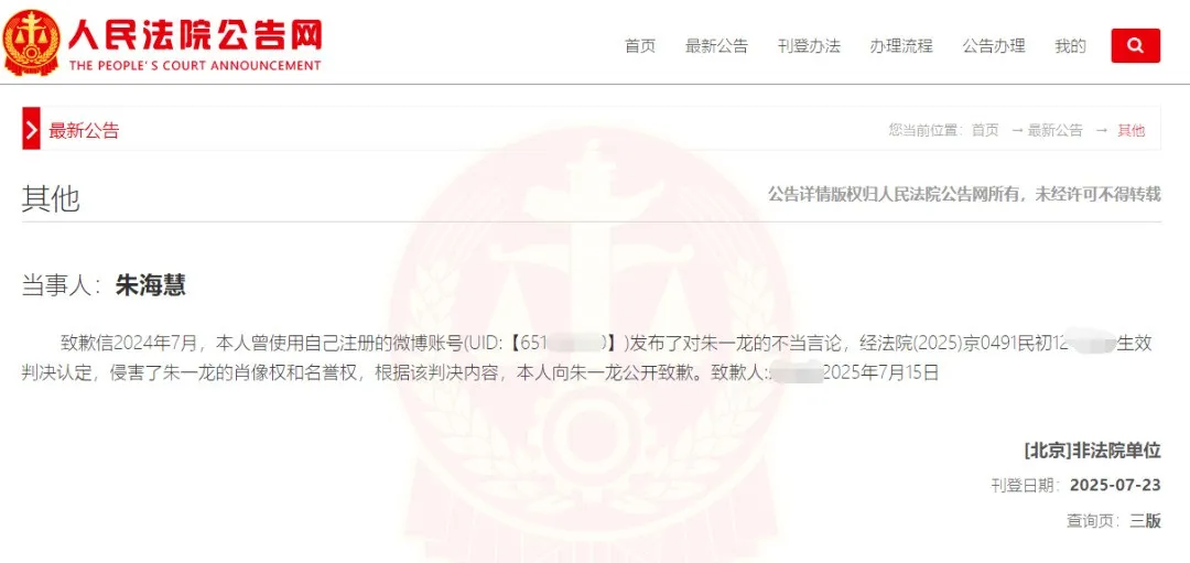 7月23日,人民法院报刊登朱某某致歉信。公告显示,朱某某2024年7月,曾使用自己注册的微博账号(UID:【6511602***】)发布了对朱一龙的不当言论,经法院(2025)京0491民初12***号生效判决认定,侵害了朱一龙的肖像权和名誉权,根据该判决内容,本人向朱一龙公开致歉。