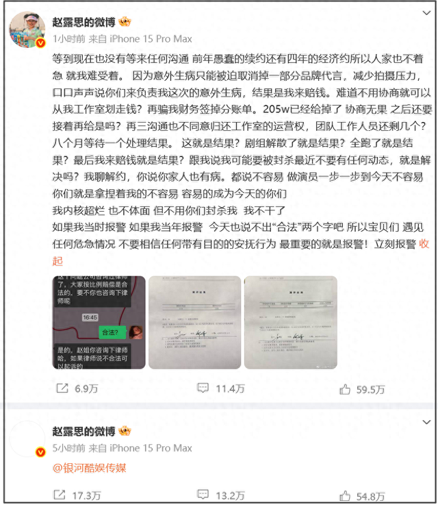 今日下午,赵露思还曾发布微博“@银河酷娱传媒 ”,除此之外并无其他正文。