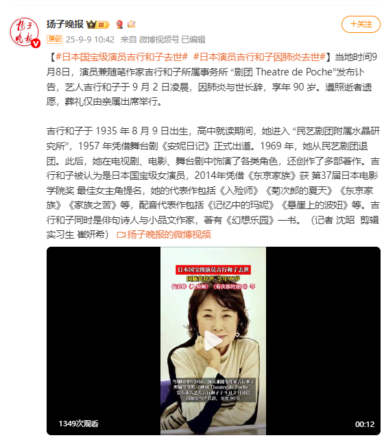 吉行和子于 1935 年 8 月 9 日出生,高中就读期间,她进入 “民艺剧团附属水晶研究所”,1957 年凭借舞台剧《安妮日记》正式出道。1969 年,她从民艺剧团退团。此后,她在电视剧、电影、舞台剧中饰演了各类角色,还创作了多部著作。吉行和子被认为是日本国宝级女演员,2014年凭借《东京家族》获 第37届日本电影学院奖 最佳女主角提名,她的代表作包括《入殓师》《菊次郎的夏天》《东京家族》《家族之苦》等,配音代表作包括《记忆中的玛妮》《悬崖上的波妞》等。吉行和子同时是俳句诗人与小品文作家,著有《幻想乐园》一书。(记者 沈昭 剪辑 实习生 崔妍希)