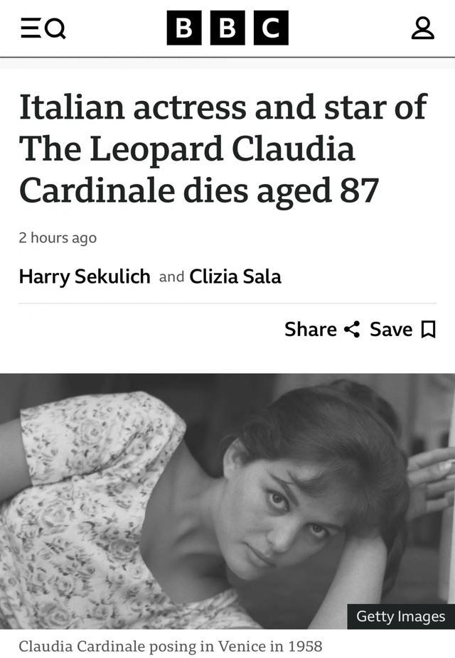 据多家外媒报道,意大利著名演员克劳迪娅·卡汀娜(Claudia Cardinale)去世,终年87岁。