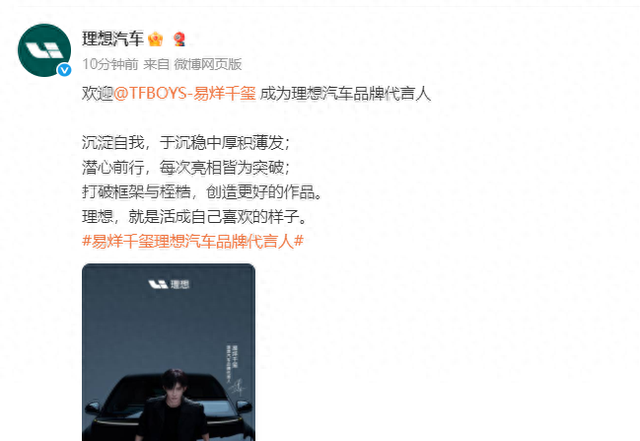 理想汽车在官方微信号中表示,欢迎易烊千玺成为理想汽车品牌代言人。9月25日,理想汽车曾在官微发布消息称,“打破条条框框,创造更好的作品。理想,就是活成自己喜欢的样子。理想汽车品牌代言人,明天见。”(旺旺)