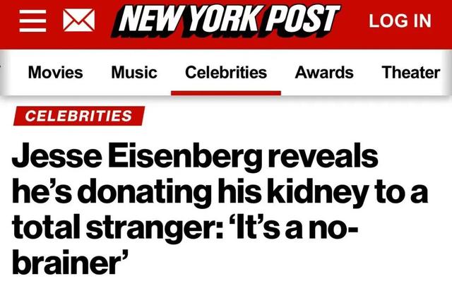 杰西·艾森伯格透露,他将把自己的一颗肾脏捐赠给一位完全陌生的人