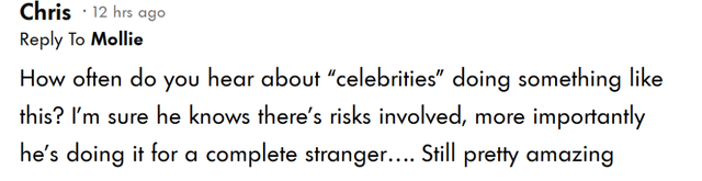 你多久能听到一次 “名人” 做这样的事啊?他肯定知道这里面存在风险,更重要的是,他做这件事是为了一个完全陌生的人……这非常了不起。
