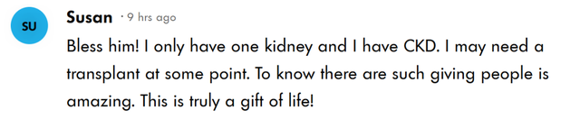 真是太感谢他了!我只有一个肾,而且患有慢性肾病。我可能迟早需要肾移植。知道世上有这样乐于助人的人,真是太棒了。这真是生命的馈赠!