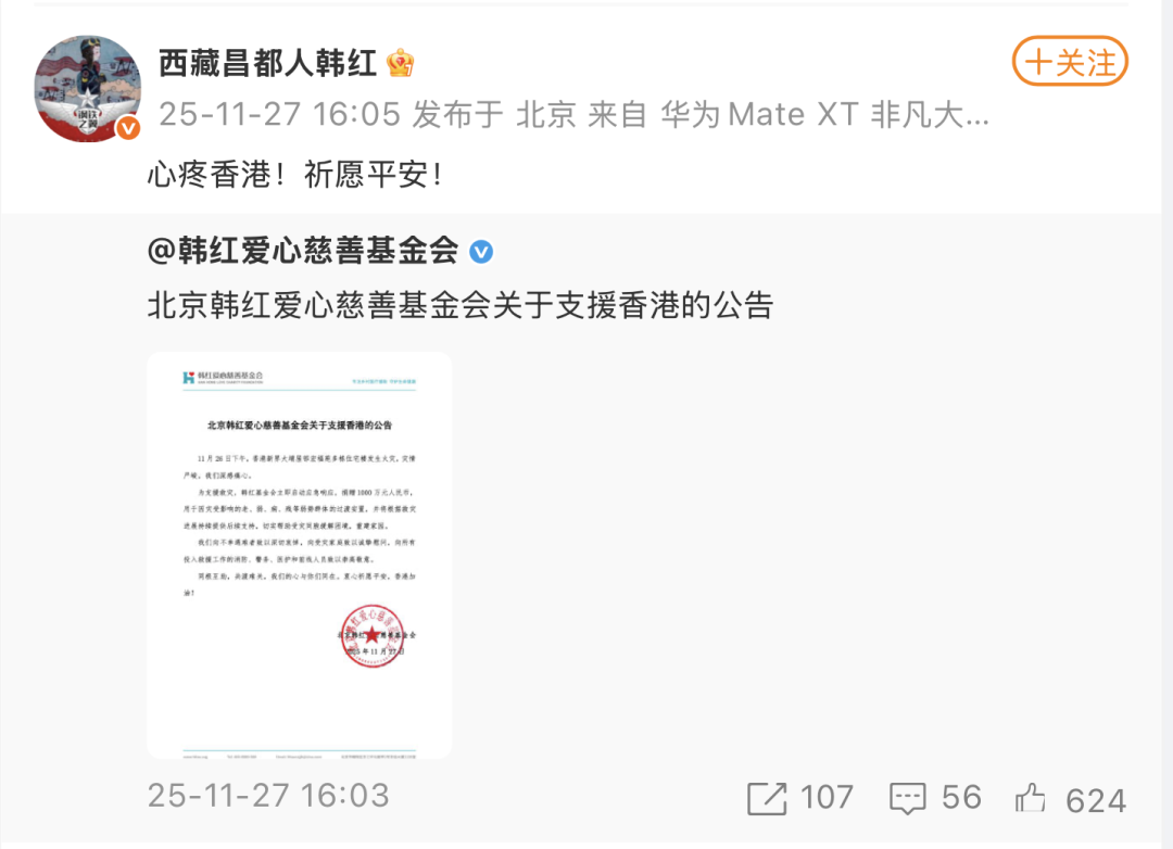 此外,今日@韩红爱心慈善基金会 也发文称,为支援救灾,韩红基金会立即启动应急响应,捐赠1000万元人民币用于因灾受影响的老、弱、病、残等弱势群体的过渡安置,并将根据救灾进展持续提供后续支持,切实帮助受灾同胞缓解困境,重建家园。随后,@西藏昌都人韩红 转发相关公告并发文:心疼香港!祈愿平安!
