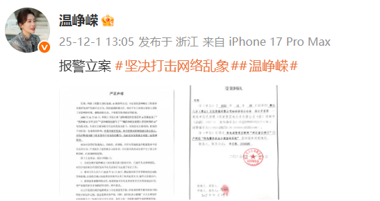 12月1日,演员温峥嵘发微博称,针对被盗播、AI换脸,已经报警立案,并晒出了受案回执。
