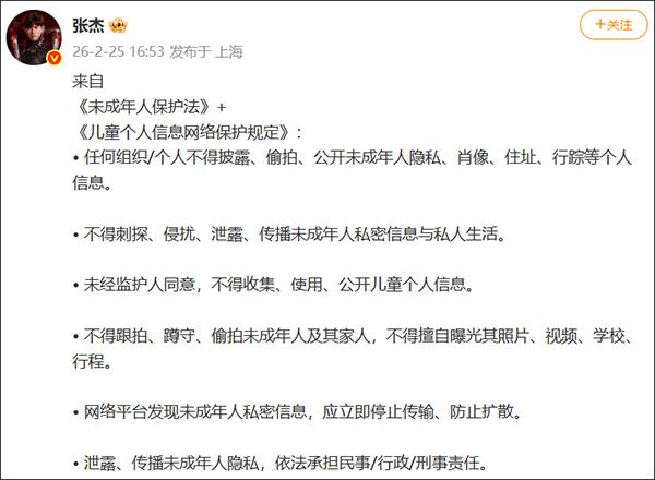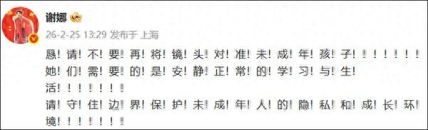 2月25日,@谢娜 在社交平台发文,用了68个感叹号:“恳请不要再将镜头对准未成年孩子!她们需要的是安静正常的学习与生活!请守住边界保护未成年人的隐私和成长环境!”