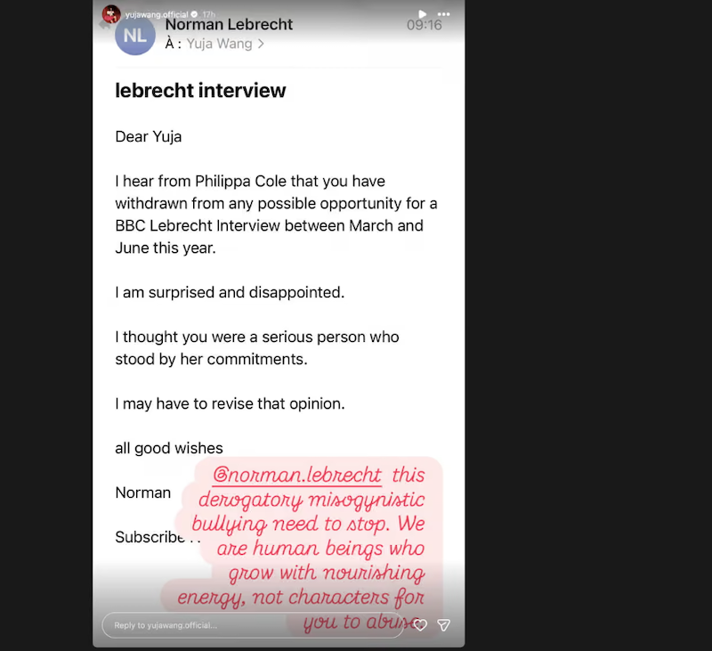 钢琴家王羽佳将乐评人诺曼·莱布雷希特的邮件截图发布在社交媒体上,并贴上“霸凌”的标签。一天后,BBC广播三台对外宣布,不再与莱布雷希特合作。