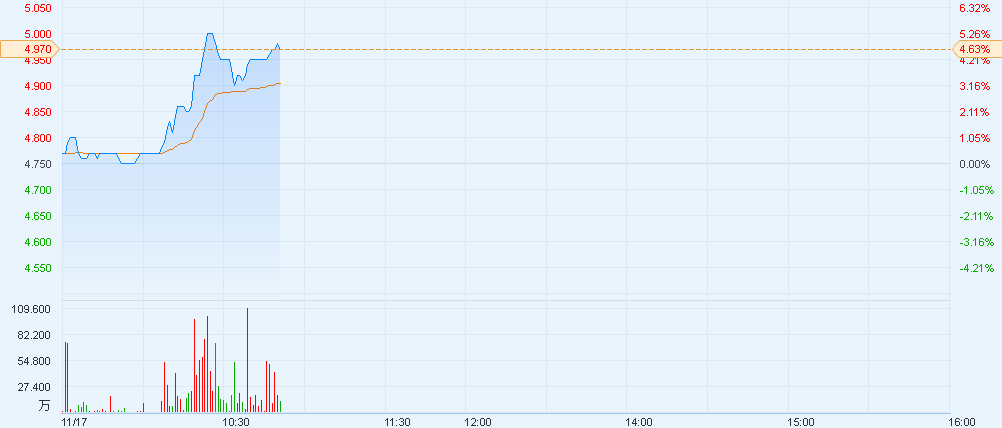 中国软件国际(00354)股价造好,创52周新高见5.01港元,截至10时45分,涨4.42%,报价4.97港元,成交额为8623万港元。