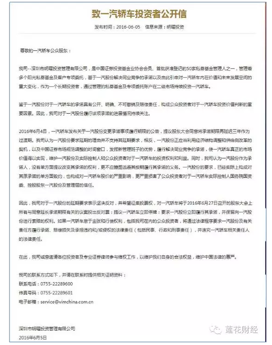更有私募公开反对一汽轿车延期承诺。明曜投资6月5日在其网站上发布“致一汽轿车投资者公开信”,表明对于一汽股份的延期要求表示坚决反对,并希望征集投票权,对一汽轿车将于6月27日召开的股东大会上所有与同意延长承诺期限有关的议案投出反对票;提议一汽轿车立即停牌;要求一汽股份立即履行其承诺,并保留向一汽股份进行索赔的权利。