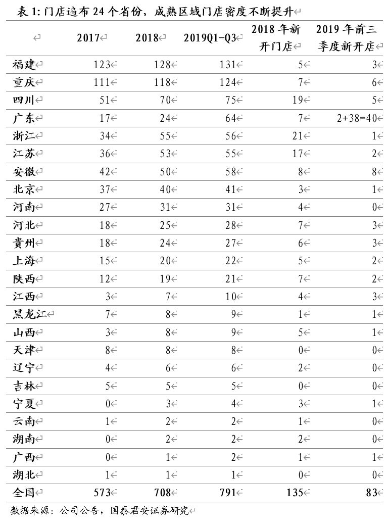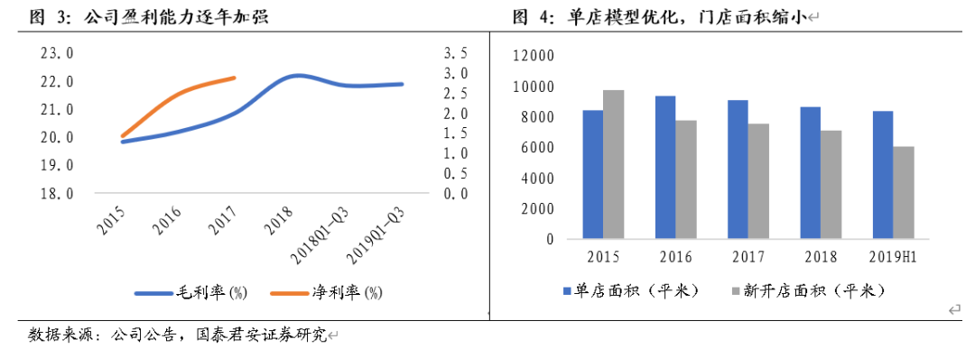 优势区域密度强化,盈利能力持续提升。截至2019Q3,公司已经进入24个省或直辖市,已开业门店达791家。从门店分布来看,成熟区域福建和重庆的门店数量分别为131和124家,次新区域四川、广东、浙江、江苏、安徽、北京、河南的门店数量分别在30-100家之间,另有河北、贵州、上海、陕西四大成长区域的门店数量分别介于20-30家。从近年来的新开店情况看,一方面新开店单店面积从2015年的9775平米缩小至2019H1的6048平米,单店模型不断优化,另一方面新开店主要分布公司的优势区域。尽管近年来公司开店速度不断加快,但随着区域密度提升,云超的竞争优势和盈利能力也在不断强化。2015-2018年,公司综合毛利率一路从19.8%提升至22.2%,2018年以后受创新业务亏损拖累,公司净利率有所下滑,但2015-2017年净利率从1.4%提升至2.9%,预计随着云超主业效率不断优化,创新业务扩张放缓,公司净利率有望逐步回升。