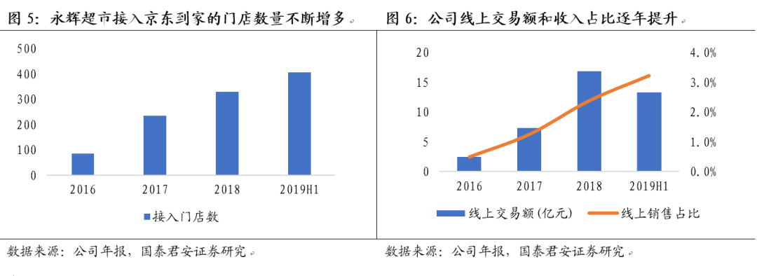 自研开发永辉生活APP,多模式推动到家服务快速增长。2017年公司推出自主研发的永辉生活APP,累计注册用户289万,9月推出永辉生活小程序,半年内获新客73万。2017年线上交易额总计7.3亿元,是2016年的三倍。2018年公司到家业务已覆盖20个省区的88个城市,共计490家门店,实现销售额16.8亿元,占比2.4%,同比提高1.5%。2019年上半年超市到家业务已覆盖22个省区的109个城市,共计518家门店,实现销售额13.3亿元,线上销售占比3.4%。