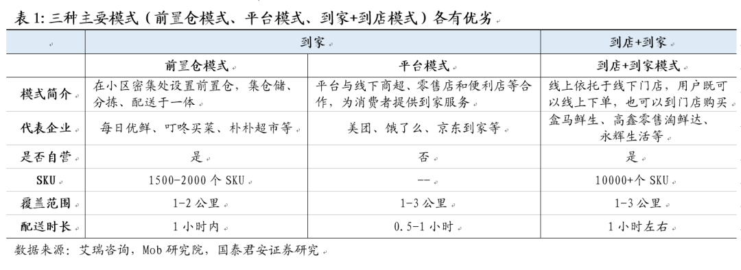 生鲜到家主要分为三种模式,不同模式各有优劣。生鲜到家发展前景广阔,吸引了众多玩家加入,既有美团、饿了么、京东到家等综合外卖平台模式的商家,也有每日优鲜、叮咚买菜等前置仓模式的垂直生鲜电商模式,还有盒马鲜生、高鑫零售淘鲜达、永辉生活等基于线下门店的生鲜到家模式。相比之下,前置仓模式下,产品自营品质有保障,配送时效也相对较高,但前期固定资产和人力投入最多,模式最重;平台模式下,配送效率高,固定资产和人力投入最少,但因为产品非自营其品质和供应稳定性无法保障,而且高峰时期可能存在运力不足和运费涨价的问题;到店+到家模式下,SKU最丰富,线上线下一体化体验效果好,固定资产和人力资本投入居中。