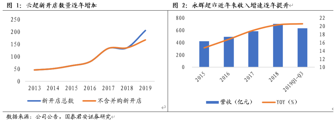 云超开店速度逐年加快,收入增速持续提升。随着公司的供应链及中后台系统不断完善,2015年以来开店速度持续加快,尤其是2017年以后每年新开大店都在100家以上,2019年新增云超门店205家(其中包含收购百佳38家)。受益于开店速度持续加快,近年来公司的营收增速也持续提升,从2015年的14.8%提高至2019年前三季度的20.6%,预计2020年有望新开云超150家,收入增速有望进一步提升。