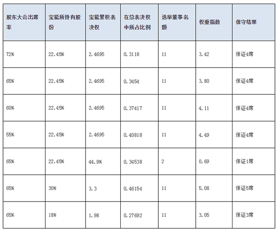 我们假设所有非宝能持有的股份均作为宝能的对立方,在这种最大的不利情况下,对宝能持有的表决权、出席率等进行测试: