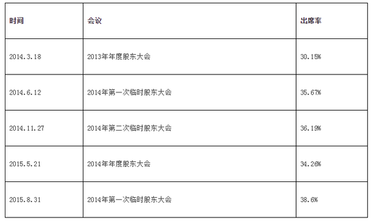 以下是2014年和2015年万科股东大会出席率统计(注:根据万科历次股东大会公告整理):