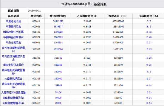 据wind数据显示,一汽轿车在一季度被14只基金纳入前十大重仓名单中,增仓3,015.73万股至5,616.15万股,持股总市值79,131.60万元。