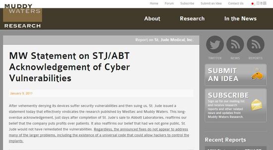 记者浏览浑水公司官网发现,其最近一篇报告发布于2017年1月9日,是关于一家美国上市的医药公司(St. Jude Medical)的做空报告。