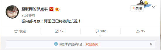 新浪财经讯 今天中午,微博账号“互联网的那点事”发布微博称:“据内部消息:阿里巴巴将收购乐视!”,截至目前该微博转发近200。