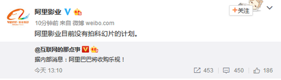 随后阿里影业转发该大V的微博称:“阿里影业目前没有拍科幻片的计划。 ”否认了收购传闻。