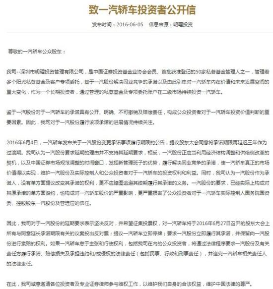 一家名为明曜投资的私募6月5日直接在官网发布公开信,质疑一汽单方面提议改变其承诺的权利,称这已经实际上构成对原承诺的单方面毁约,并且呼吁投资者对一汽的延长承诺期议案投反对票。