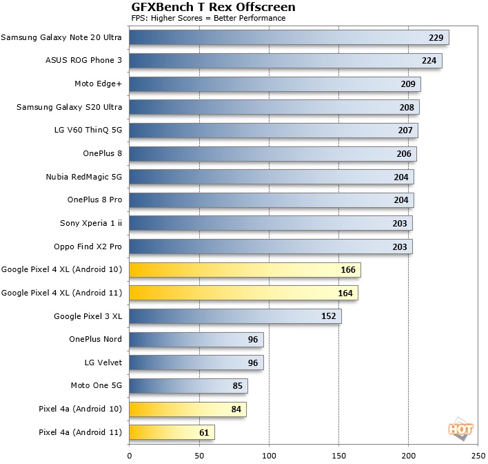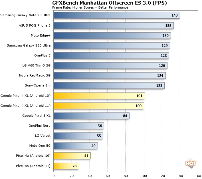 GFXBenchmark 测试情况,Pixel 4a 性能下降严重,但 Pixel 4 XL 几乎没有变化。