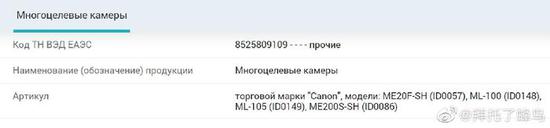 佳能未发布的“多用途相机”“ML-100”和“ML-105”在海外的认证机构登记,或为ME20F-SH的新版本。