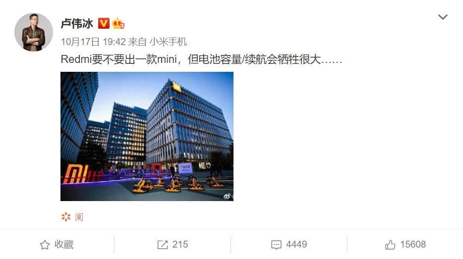 小米在这方面也不例外,因为其在 2020 年发布的几乎所有手机都采用 6.4 英寸或更大的屏幕。近日 Redmi 总经理、小米高管卢伟冰在微博上暗示,Redmi 考虑推出一款 mini 手机,卢伟冰在微博称:“Redmi 要不要出一款 mini,但电池容量 / 续航会牺牲很大……”
