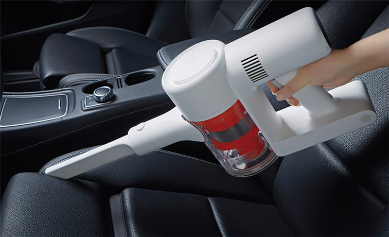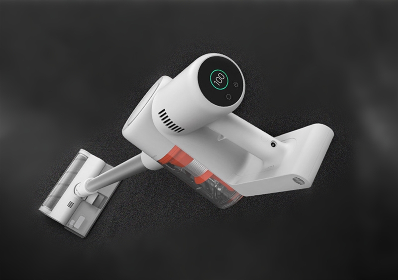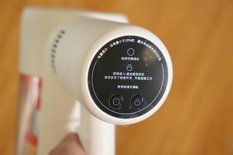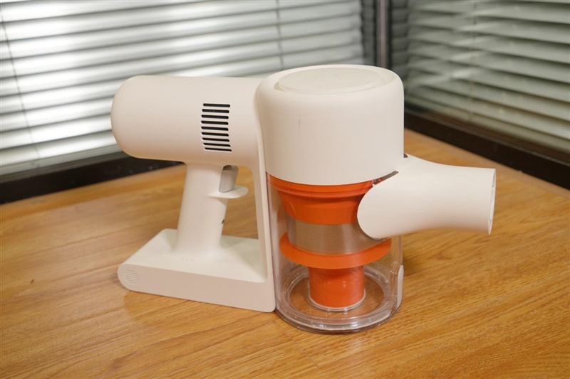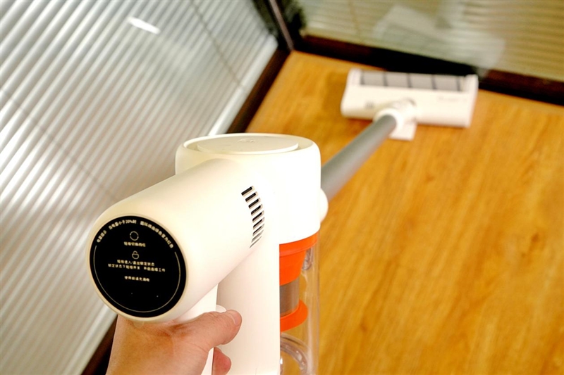 先来看主机,红白配色相当令人熟悉,也是米家净化器、米家扫地机器人等小米系小家电常常出现的风格。它采用的是枪式手柄和扳机式开关设计,方便在举臂清理墙壁、窗帘和天花板的时候让机器重心更靠近手臂。