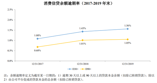 2019年,蚂蚁消费信贷余额30天以上的逾期率为1.56%,90天以上的逾期率为1.05%