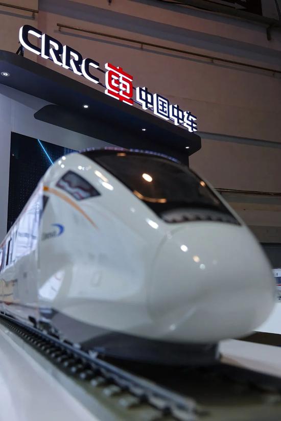2019年青岛国际软件融合创新博览会,中国中车展出的“复兴号”动车组模型。图片来源:视觉中国