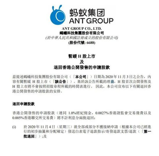 蚂蚁公告:退回香港公开发售的申请股款