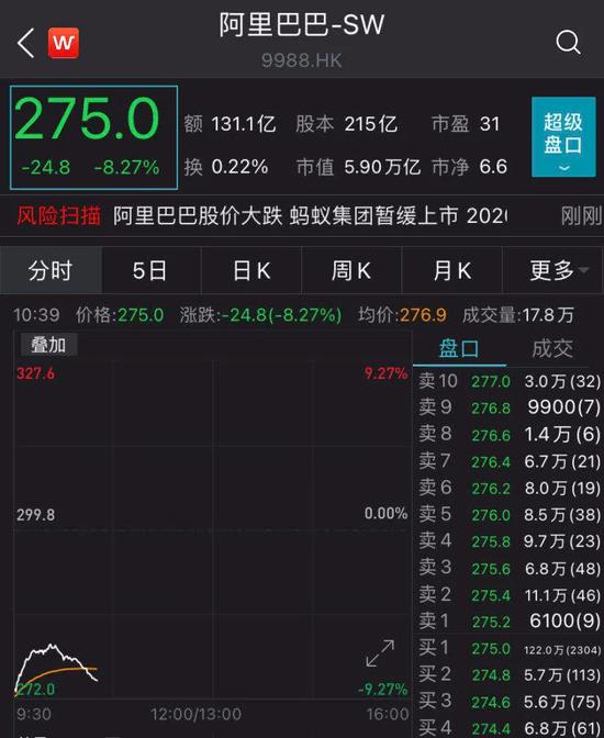 11月4日,阿里巴巴(9988.HK)公告,阿里巴巴集团的非并表关联方蚂蚁集团宣布其今天接获中国内地相关监管机构的通知,由于蚂蚁集团实际控制人及执行董事长、总经理被监管约谈以及金融科技监管环境发生变化等重大事项,可能会使得其不符合相关发行上市条件,或者信息披露要求,因此决定暂缓蚂蚁集团的A股于上海证券交易所科创板上市。因此,蚂蚁集团同时进行的H股于香港联交所主版上市亦将暂缓。