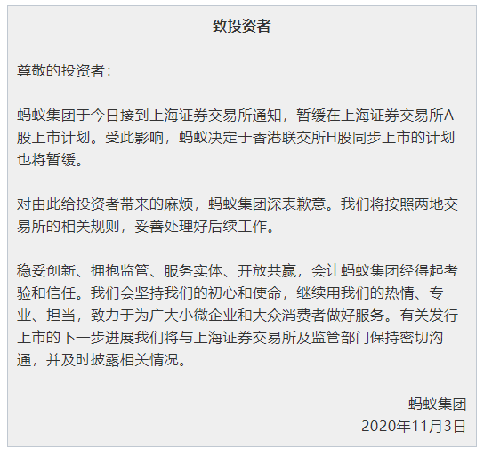 针对两地上市暂缓一事,蚂蚁集团在官方微信公号发布《致投资者》一文回应致歉: