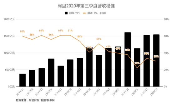 截至9月末的这一季度,阿里巴巴营收仍旧稳健。收入1550.59亿元人民币,超过市场预期的1548.41亿元,增速同比30.3%,略低于上一季的33.78%。