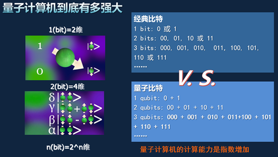 量子系统与经典系统有本质区别。在经典计算机中,经典比特(我们通常就简称为比特),就是0和1,但在量子计算中,由于量子系统的特殊性,量子比特不再是一个简单的0和1,它是一个展开的二维空间。1个比特就展开一个二维的空间;如果是2个比特,则展开一个四维的空间;3个比特则是八维的空间。如果有N个比特,展开的空间就是2N维度。这是一件非常可怕的事情,如果有300个比特的话,展开空间的维数就比宇宙的原子数目还要多了。