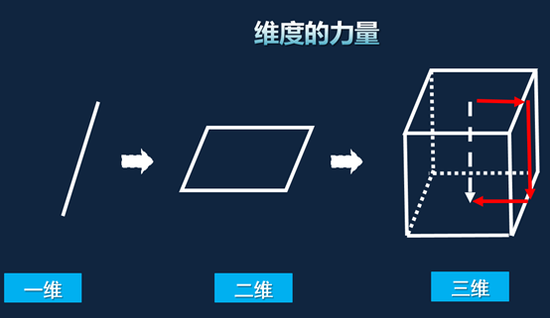 具备了这种指数加速能力,那么在某些问题上面,量子计算能力的提升将是可怕的。我们画一个简单的图,希望能够给出一个直观的解释。一根线,我们叫做一维,而一个面是二维的,一个立方体是三维的。大家没有办法想象四维是什么样子,但在线性代数中,其实我们很容易就会知道一个高维空间到底是什么。