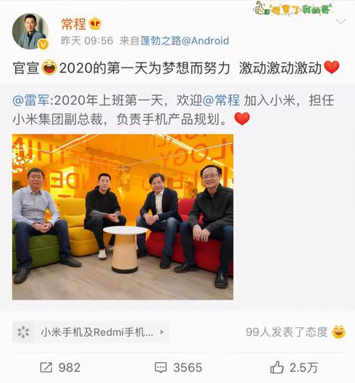 昔日大哥被初出茅庐的小弟远远甩下,自然不会甘心,但二者的“恩怨”不止于此。2019年年底,前联想集团副总裁常程以“身体健康”“照顾家庭”为由,从联想离职。令人意外的是,离职仅两天,2020年1月2日,小米雷军高调宣布常程加入小米,担任小米集团副总裁,负责手机产品规划。常程也在微信朋友圈公开此事,并将小米称为“最美的期待”。