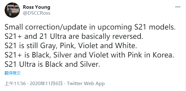今天,业内人士@Ross Young爆料,三星Galaxy S21系列三款机型都提供了多种配色。