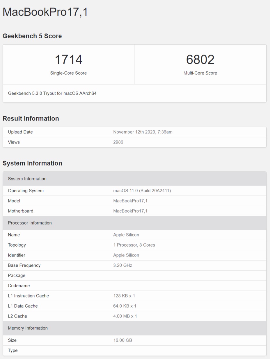Geekbench 跑分显示,这款 MacBook Pro 配备 16GB 内存,搭载 macOS 11.0 操作系统,单核得分 1714,多核得分 6802,采用 8 核处理器,基本频率为 3.20 GHz。
