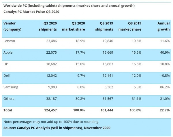 落实具体PC品牌上,联想在今年第三季度出货量超过2340万台,同比增长11.6%,市场份额为18.9%。苹果紧随其后,出货量超2200万台,同比大增40.6%,市场份额为17.7%。随后分别是惠普、戴尔、三星。