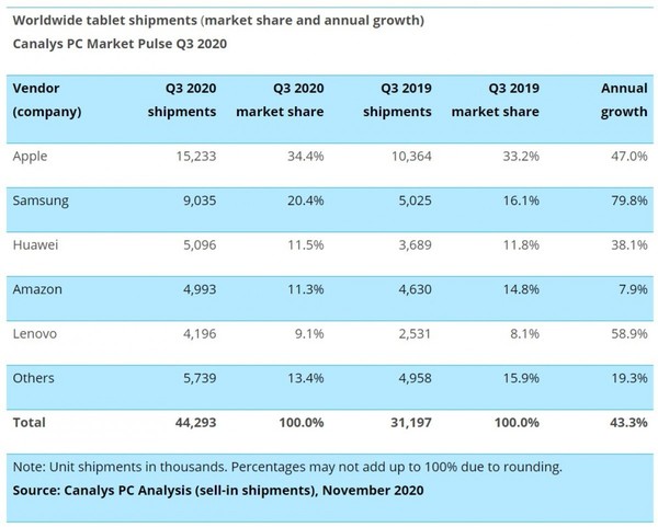 不只是PC市场,平板电脑厂商都实现了明显增长。苹果出货量达到1520万台,同比增长47%,在今年第三季度占据了34.3%的份额;三星位居第二,出货量为9035万台,虽然较苹果差距较大,但是增长率达到了恐怖的79.8%;华为依托中国和欧洲市场,出货量达5096万台,实现了38.1%的增长率。