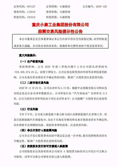 此外,小康股份公告还提示,公司控股股东以其持有的本公司部分A股股票为标的非公开发行可交换公司债券,该等可交换公司债券目前已进入换股期。