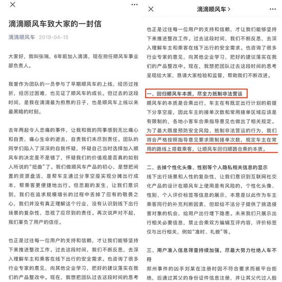 这在滴滴的发声中也得到了印证,2019年4月5日滴滴顺风车公众号《滴滴顺风车致大家的一封信》中,首要的任务就是要“回归顺风车本质,尽全力抵制非法营运”。