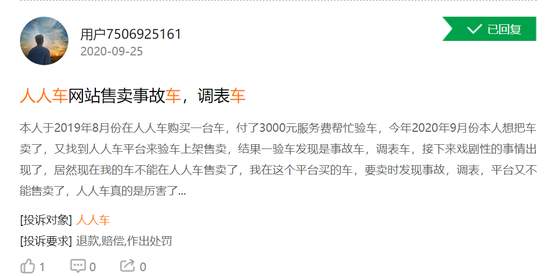 人人车在业绩上涨、拿融资的同时,也收到了用户的投诉。这些投诉的范围包括但不限于车源、服务、交易过程等多方面。